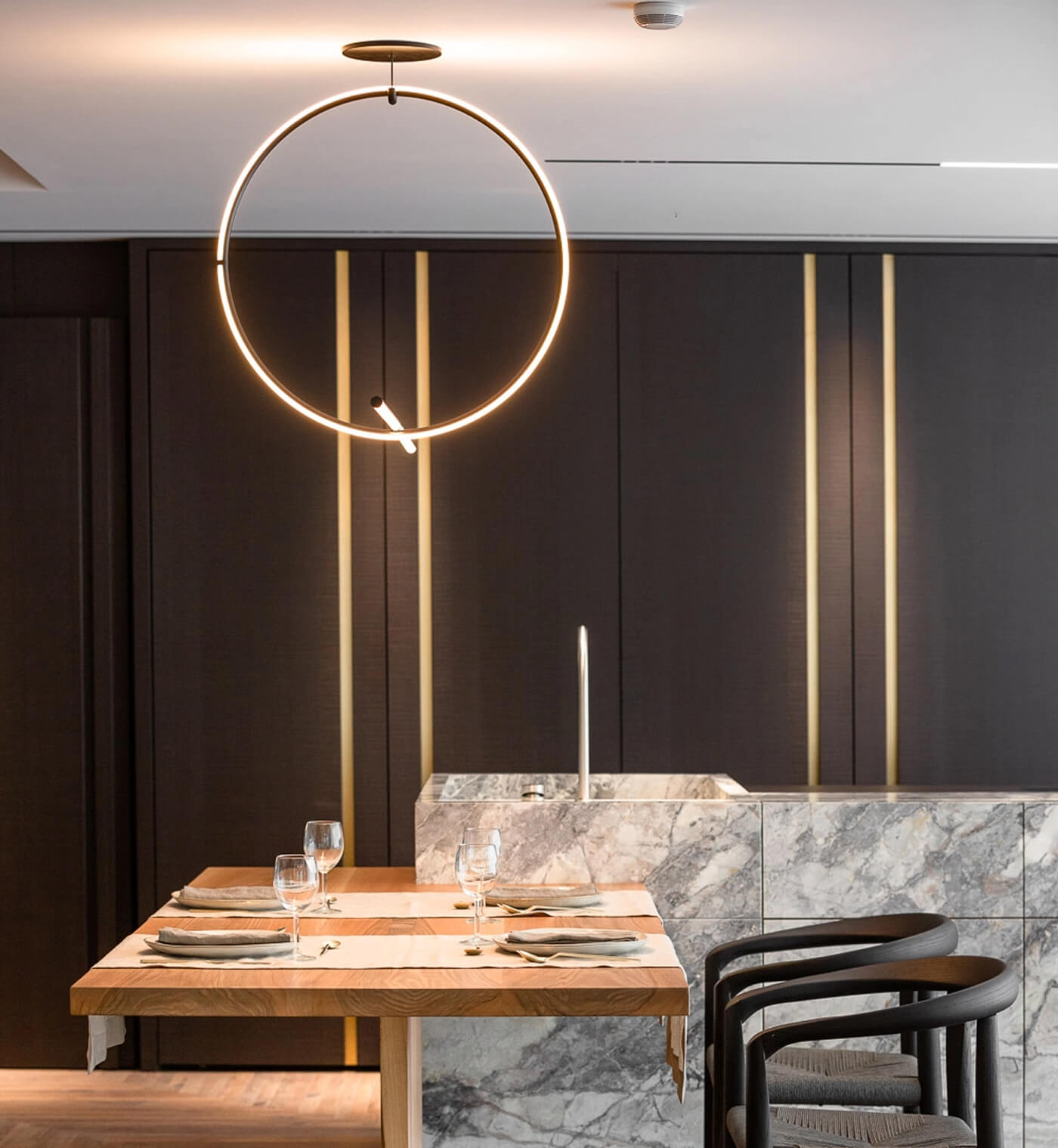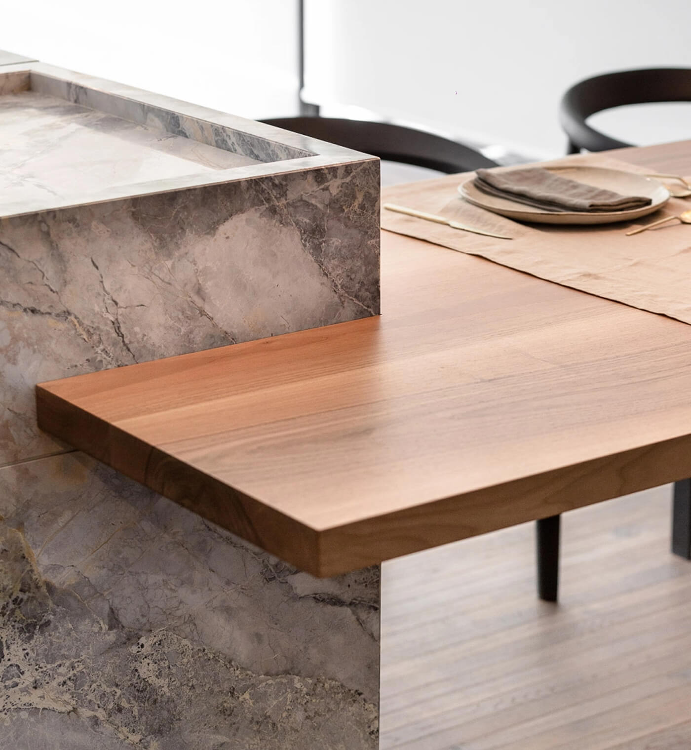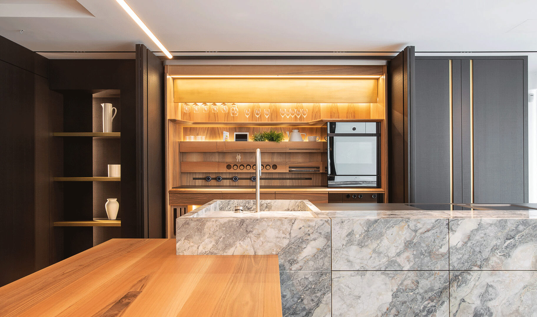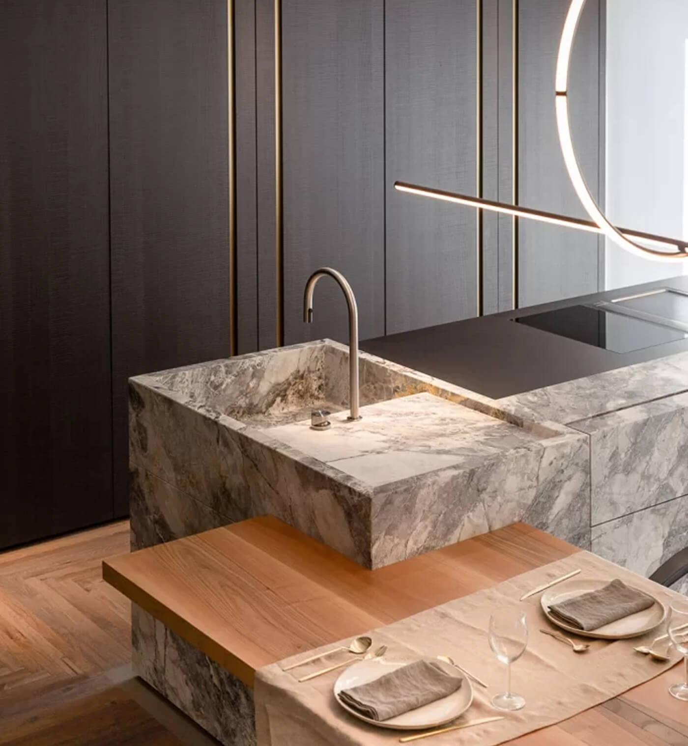 Si vengono così a creare delle zone in cui i materiali sono altamente professionali con delle caratteristiche tecniche molto elevate e delle altre in cui è il materiale stesso il vero protagonista, lasciando la stratigrafia della natura a vista e rendendo l’ambiente più caldo e accogliente. Il risultato è una cucina pensata come uno spazio da co-abitare e da godere.