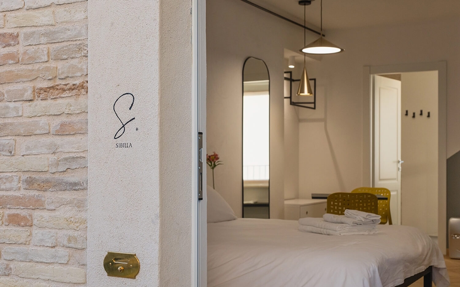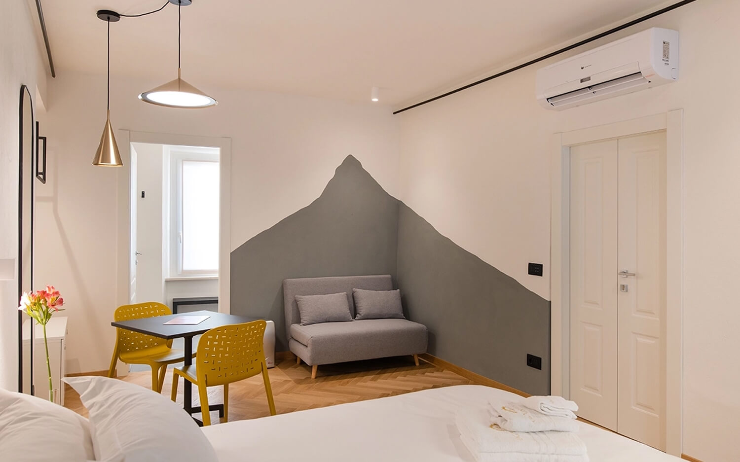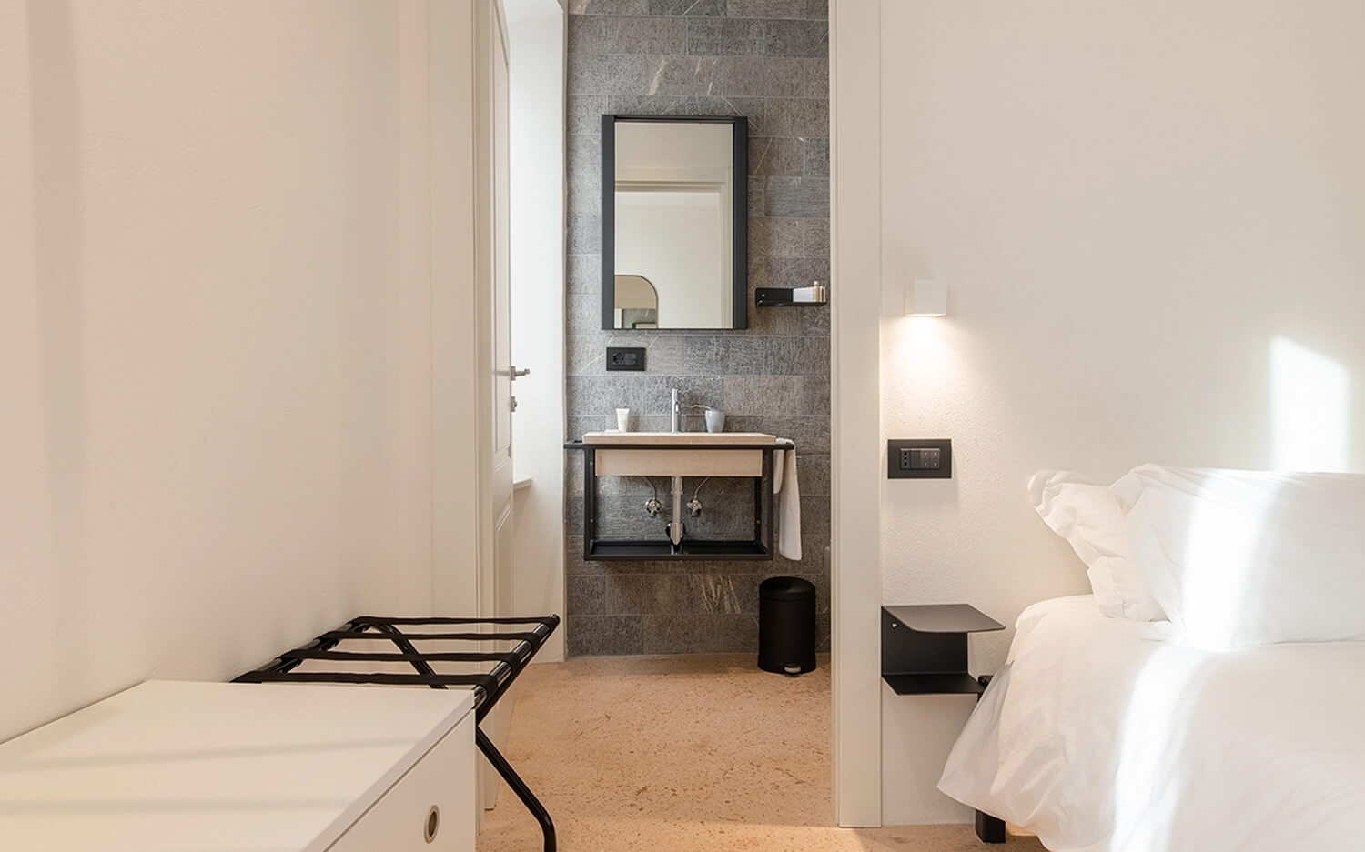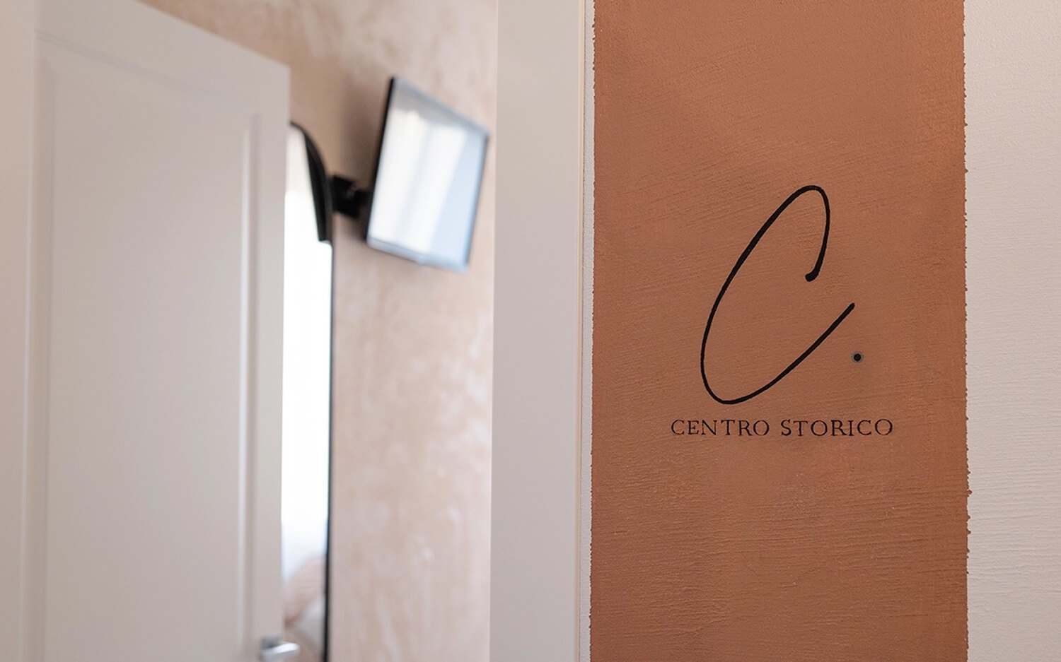 Gli intonaci, la tradizione ed i materiali per la camera ‘Centro storico’ ci riportano nei borghi del nostro entroterra, in particolare tra i vicoli della città di Fermo. Nella camera ‘Colline marchigiane’ ritroviamo quel sapore di artigianalità delle nostre campagne ed il colore delle nostre colline in primavera Una linea blu orizzontale non ben definita ci avvolge nella camera ‘Mare’, come la linea delle onde che si estende all’infinito sul nostro litorale Lo skyline che troviamo nella ‘Camera Sibiliini’ è quello che possiamo vedere da Fermo guardando verso le montagne, un profilo preciso e ben visibile che ci siamo immaginati di ammirare una sera d’estate al chiaro di luna