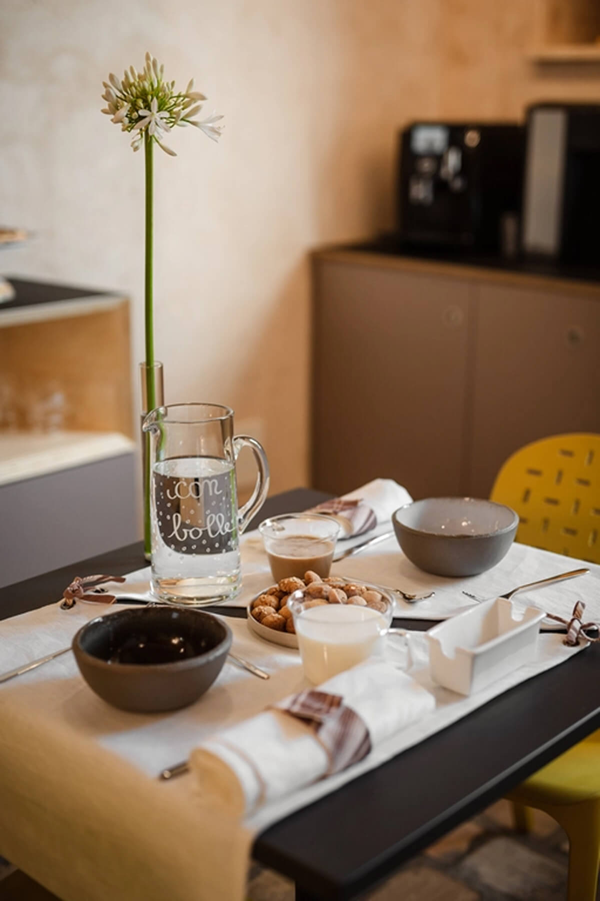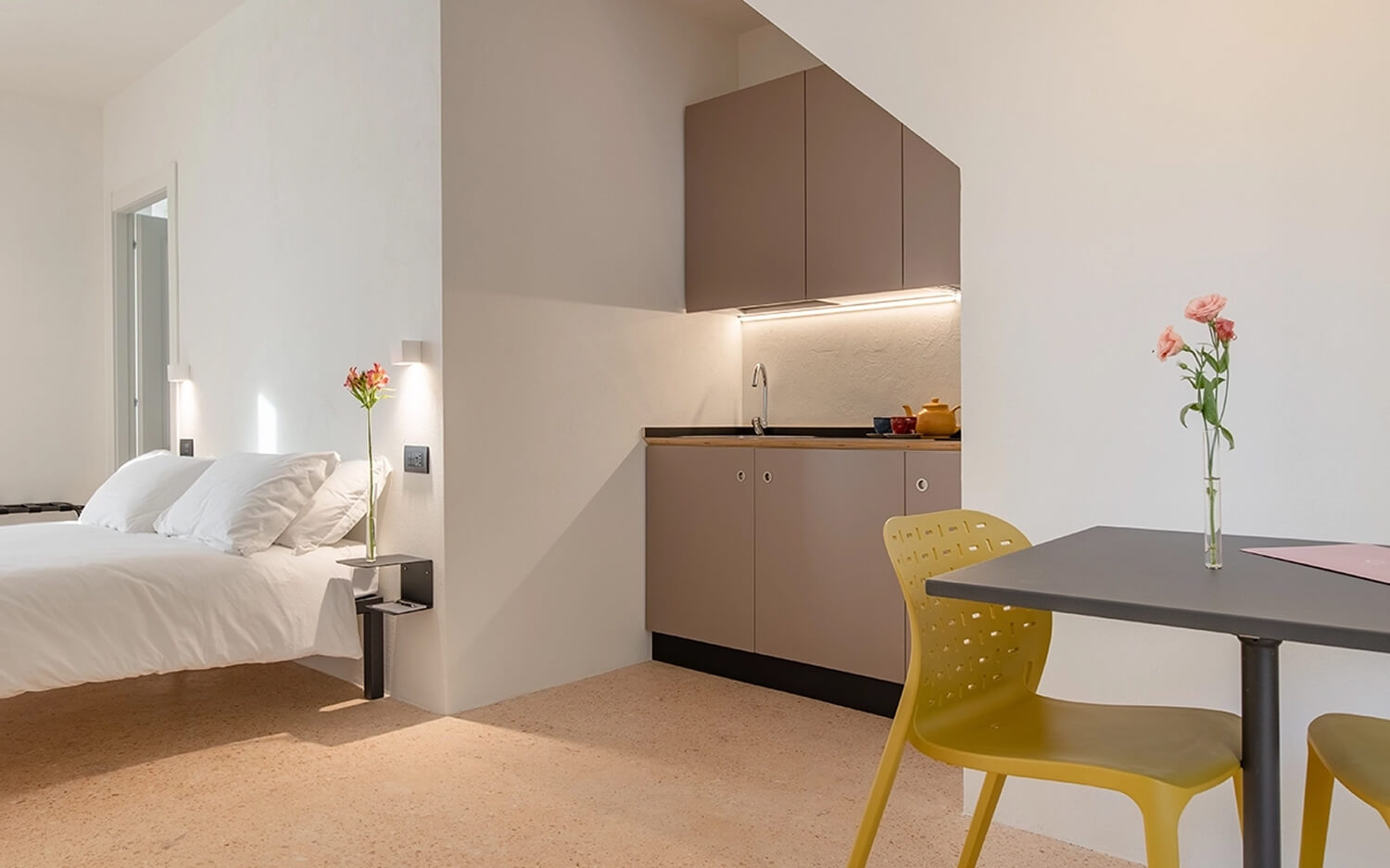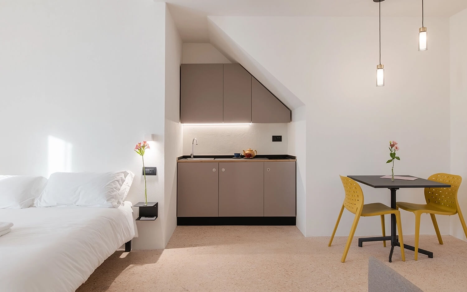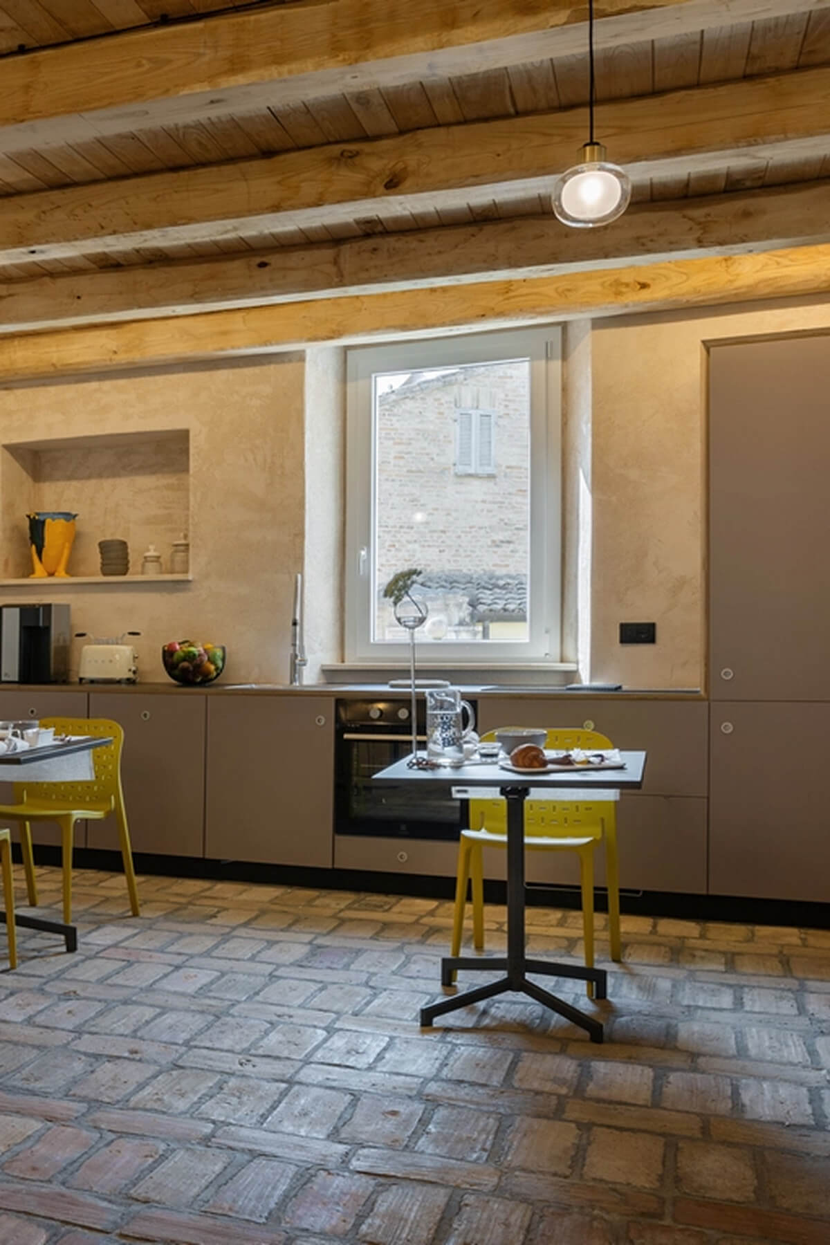 Gli intonaci, la tradizione ed i materiali per la camera ‘Centro storico’ ci riportano nei borghi del nostro entroterra, in particolare tra i vicoli della città di Fermo. Nella camera ‘Colline marchigiane’ ritroviamo quel sapore di artigianalità delle nostre campagne ed il colore delle nostre colline in primavera Una linea blu orizzontale non ben definita ci avvolge nella camera ‘Mare’, come la linea delle onde che si estende all’infinito sul nostro litorale Lo skyline che troviamo nella ‘Camera Sibiliini’ è quello che possiamo vedere da Fermo guardando verso le montagne, un profilo preciso e ben visibile che ci siamo immaginati di ammirare una sera d’estate al chiaro di luna